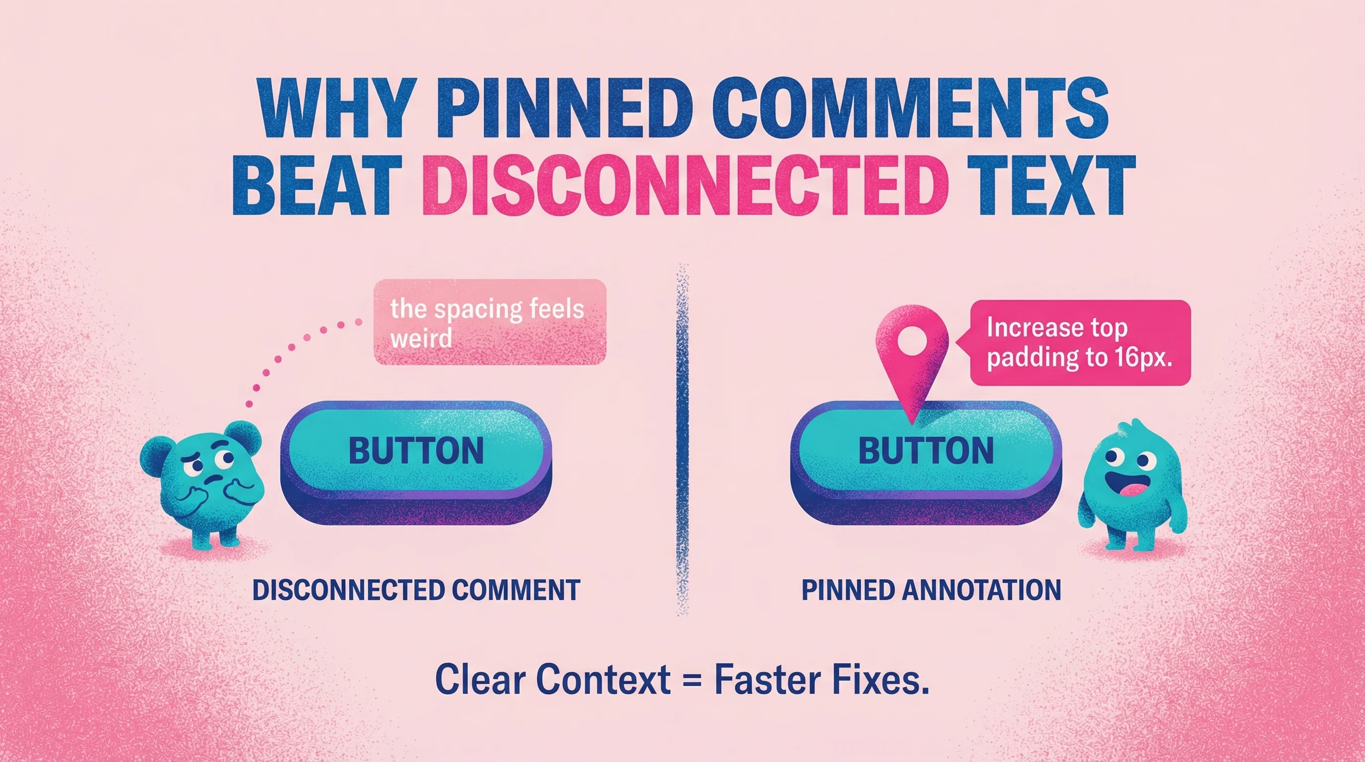 Text comments fail because design is visual. When a client types "the spacing feels weird," you're left guessing which spacing, where, and weird compared to what.