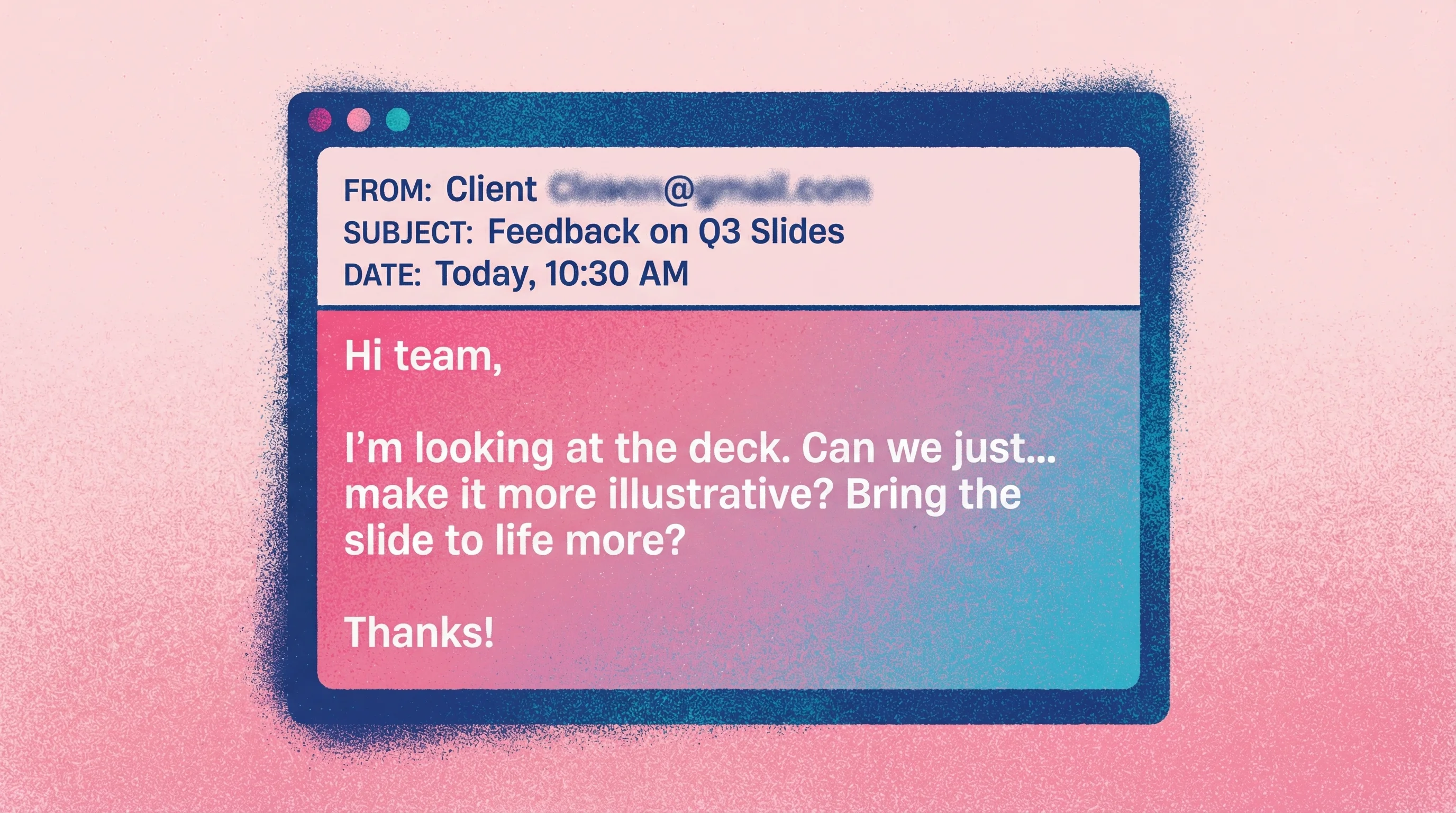 Just this month, a client told me they wanted to "bring the slide to life more" and make it "more illustrative." Illustrative can mean multiple things. Using actual illustrations, building out icon variations to show motion, adding visual metaphors. Without a way to show me what they had in mind, I was left guessing.