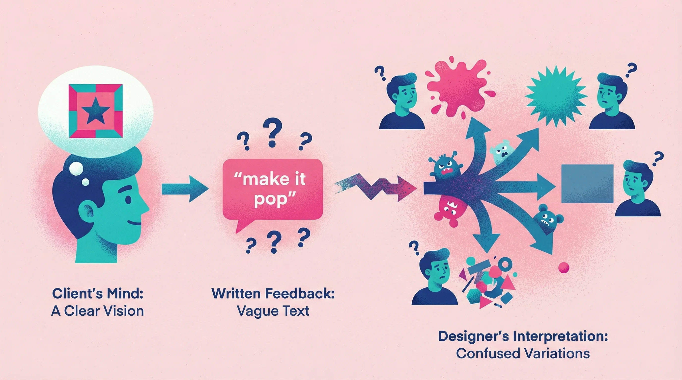 If you've freelanced or run an agency for more than a month, you've received feedback like this. After 15 years leading design teams for brands like PepsiCo, Barstool Sports, and VICE—and the last five years working independently with agencies, SaaS companies, and startups—I can tell you: the problem isn't that clients are difficult. It's that written feedback is a terrible medium for communicating visual preferences.