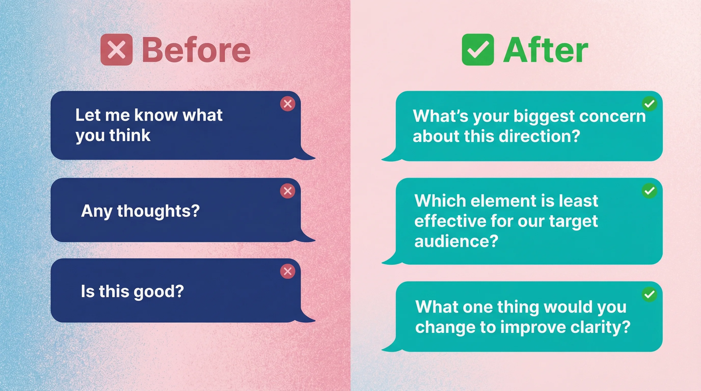 Structure prevents rambling and surfaces priorities. In one case study, a designer replaced a generic feedback email with a guided feedback questionnaire—4 out of 5 clients provided thorough responses, whereas previously many ignored the open-ended email entirely.