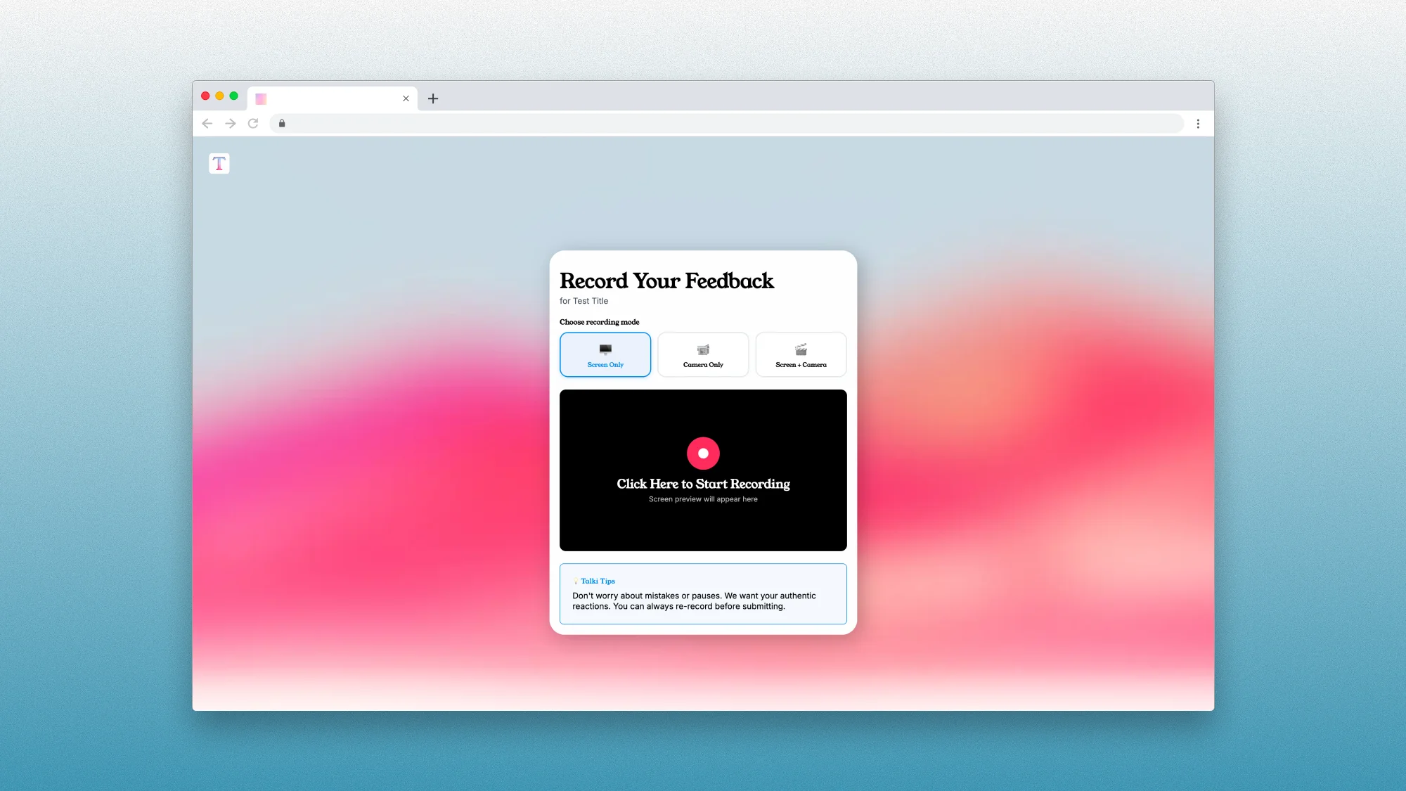 Talki lets you send a link where anyone can record their screen and voice without creating an account or installing anything. It's the only tool on this list designed specifically for collecting video, not just sending it. Perfect for agencies, consultants, and freelancers who need clients to show issues rather than describe them.