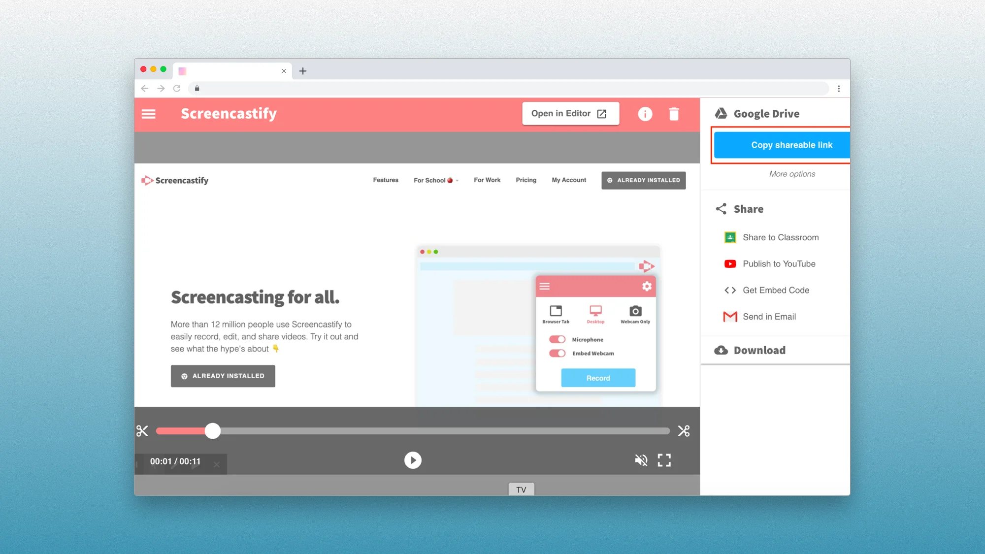 Screencastify dominates education with a Chrome extension that works perfectly on Chromebooks ($15/month for unlimited, or 30 videos/month free). The 5-minute limit on free tier encourages concise content. Integrates directly with Google Classroom and Drive.