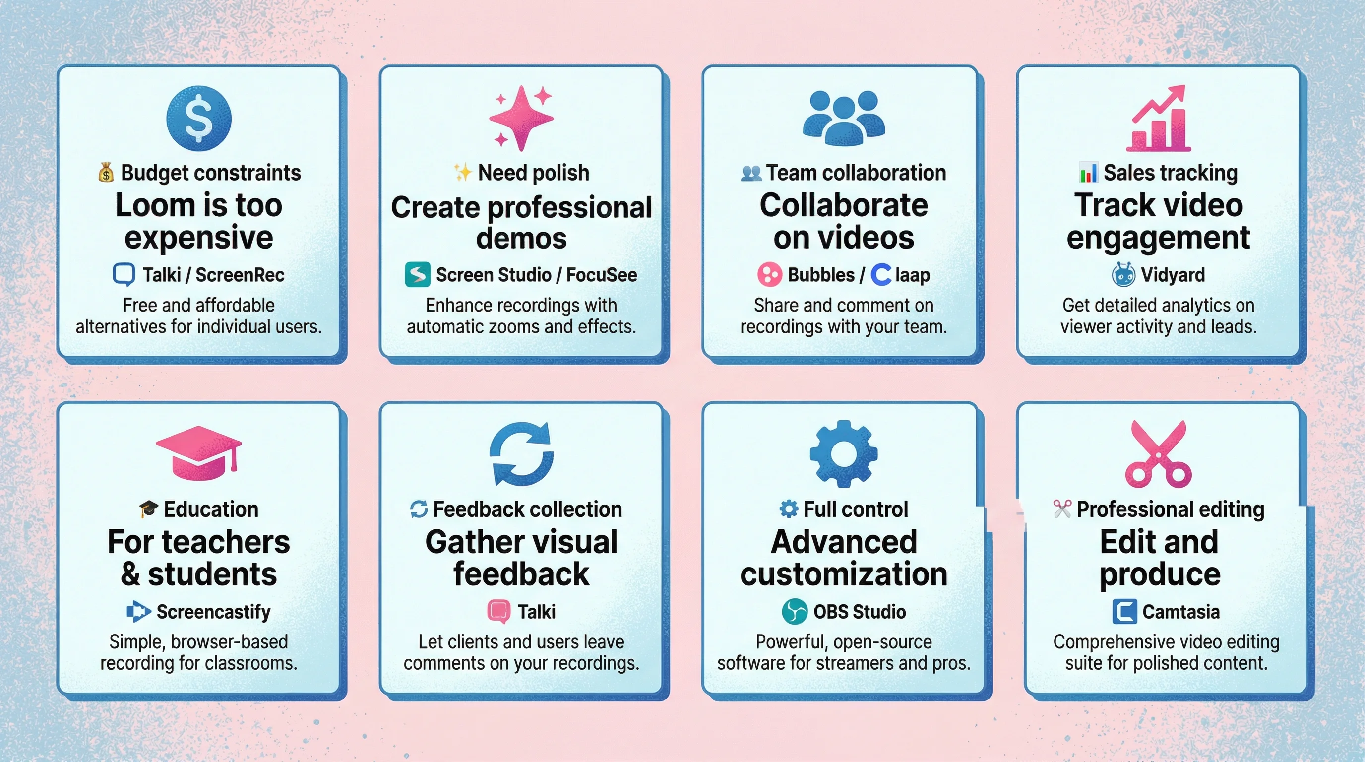 "Loom is too expensive" | Talki, Vmaker, ScreenRec | All offer generous free tiers with no catch |